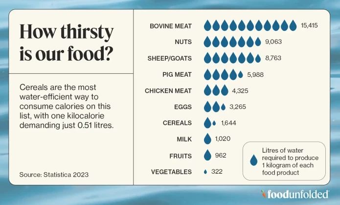 Every food is unique, and the same food can use a different amount of water depending on where and how it was farmed. But there are a few generalisations we can make. For example, fruits and vegetables usually need much less water than animal products.