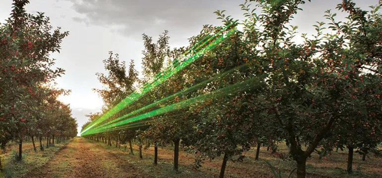 No, esta no es una excusa de los granjeros para jugar Laser Tag. En realidad, estos láseres se usan para molestar y ahuyentar a las aves. Un claro contraste de luz confunde a las aves, así que los láseres se utilizan al amanecer y al atardecer, en lugar de durante el día, cuando hay más luz solar. Sin embargo, los láseres potentes pueden ser peligrosos, por lo que existen reglas estrictas sobre quién puede usarlos y cuándo. Son rayos láser después de todo.