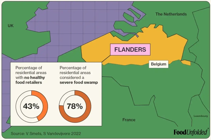 - A study in Flanders, Belgium, found that between 2008 and 2020, it got a little bit harder for people to reach supermarkets. On top of that, researchers found that about 74 per cent of residential areas in Flanders could be called food swamps.6 That means most neighbourhoods were packed with unhealthy food options, making it difficult for people to make nutritious choices.