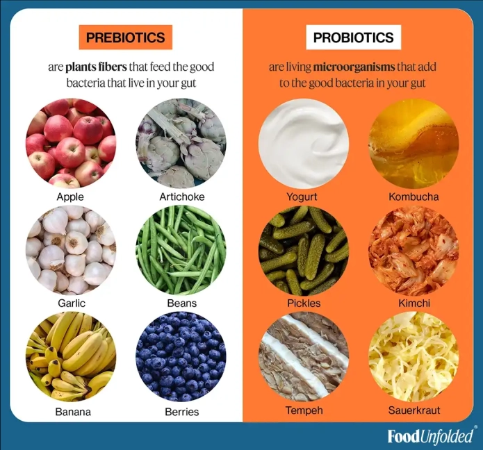 Prebiotics are types of fibre that feed the good bacteria in your gut. Unlike probiotics, which are live bacteria, prebiotics help these bacteria grow and function better.